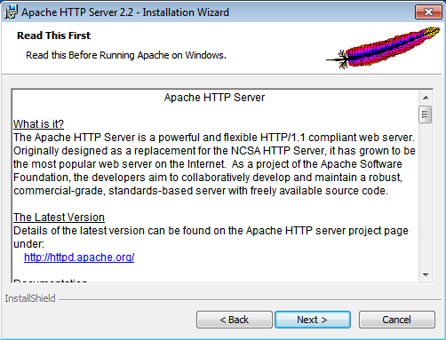 Kolejnym etapem instalacji jest informacja na temat serwera Apache HTTP, z którą należy się zapoznać. Po jej przeczytaniu można kontynuować proces instalacji.