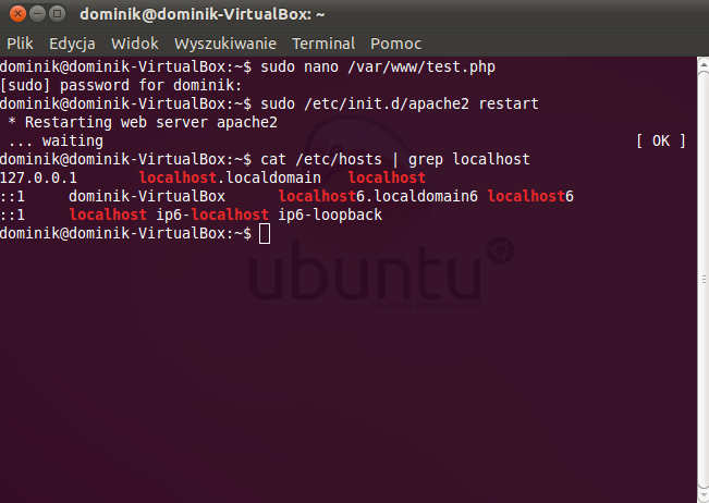 By utworzyć plik w tym katalogu należy być zalogowanym jako root lub mieć uprawnienia zapisu w tym katalogu. Kolejnym krokiem jest restart serwera Apache poniższą komendą: