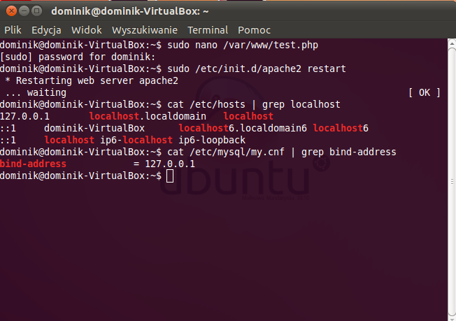 Gdy zarówno Apach jak i PHP działają poprawnie, można dokonać konfiguracji bazy danych MySQL. Powinna być ona dostępna pod adresem 127.0.0.1, pod którym dostępny jest localhost. Adres IP localhosta można sprawdzić wpisując poniższą komendę w terminalu: