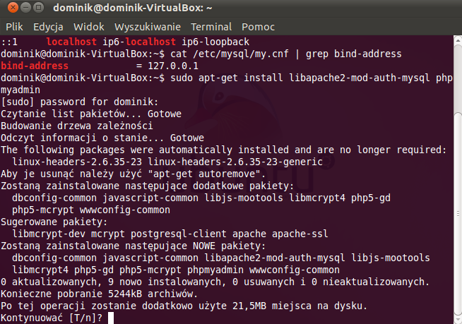 Jak oba adresy są identyczne można rozpocząć instalację phpmyadmin, który służy do zarządzania bazą danych. Instalację rozpoczyna polecenie: