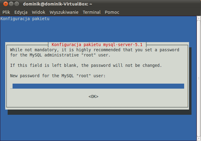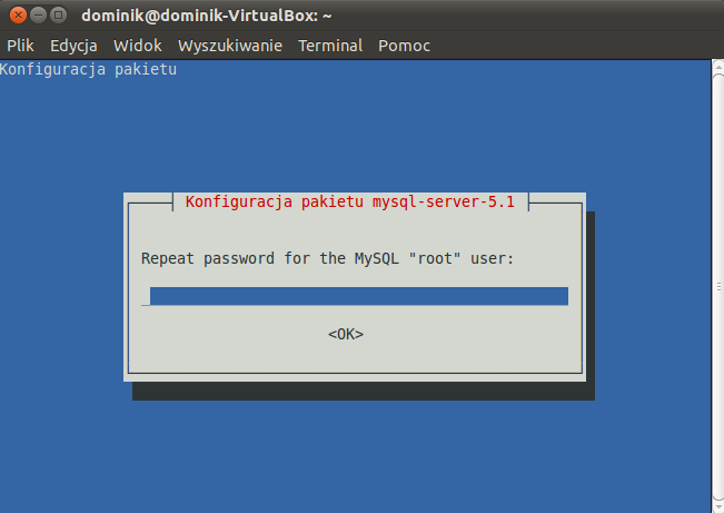W tym momencie należy podać hasło dla administratora (root) serwera MySQL i wcisnąć OK (można przejść na ten przycisk wciskając na klawiaturze przycisk Tab). Po wpisaniu hasła instalator poprosi nas o jego powtórzenie i ponowne zatwierdzenie przyciskiem OK.
