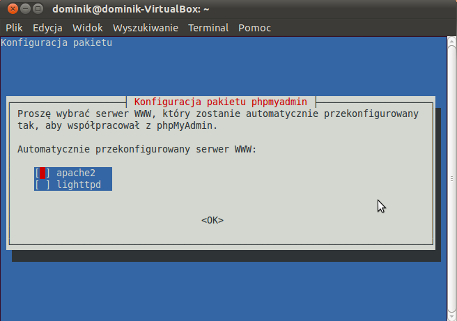 Instalator poprosi o wybranie serwera do automatycznej konfiguracji. Za pomocą spacji należy ustawić gwiazdkę (*) przy serwerze Apache 2, wcisnąć tab na klawiaturze by przejść na przycisk OK, a następnie wcisnąć enter.